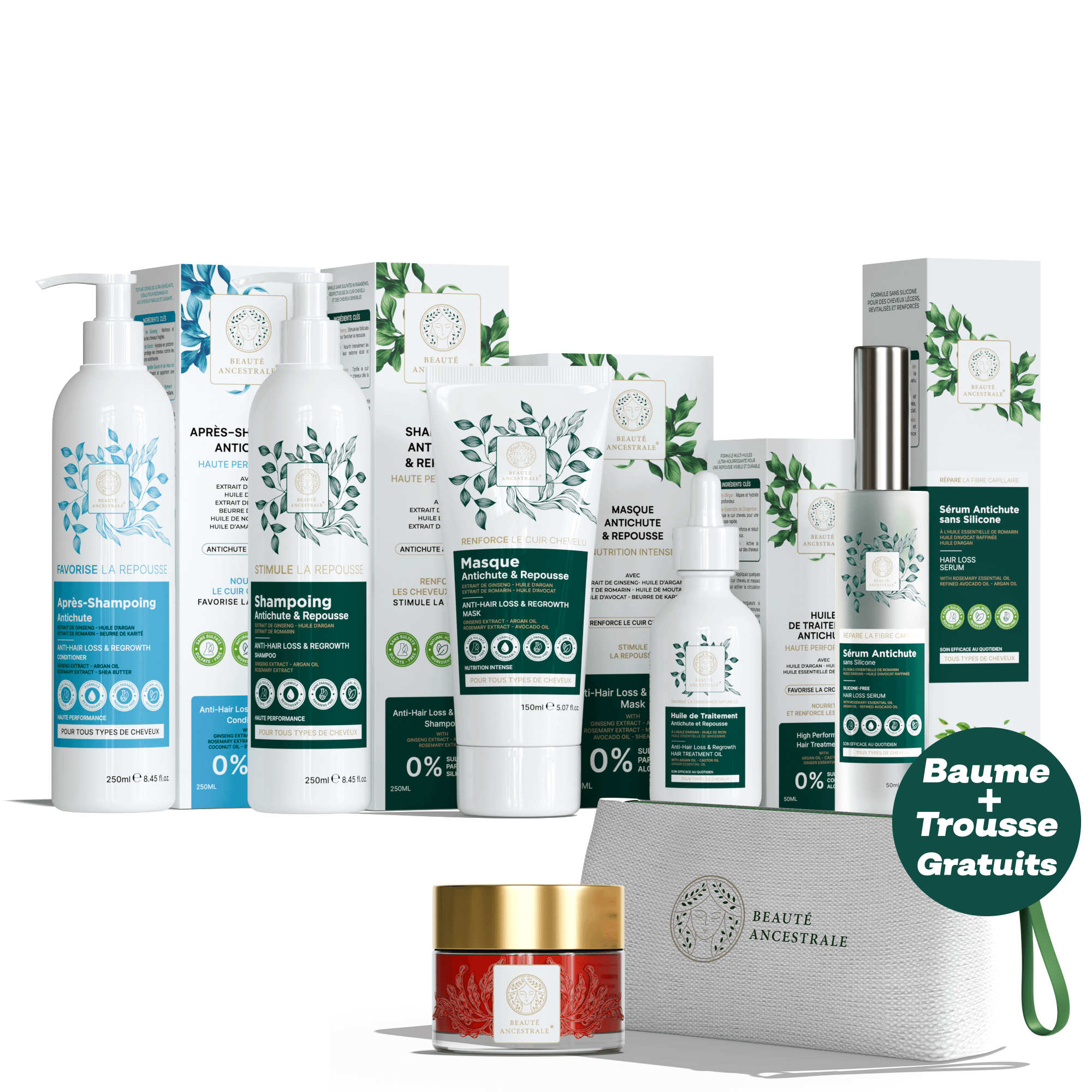 المجموعة الكاملة للعناية بالشعر ضد التساقط من Beauté Ancestrale® هو حل متكامل لمكافحة تساقط الشعر،